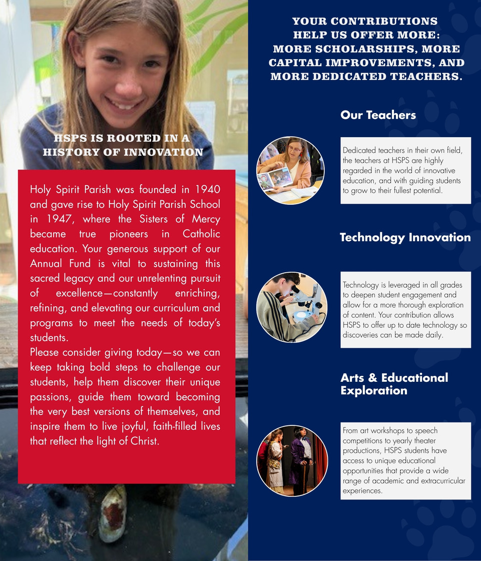 The Holy Spirit Parish School Annual Fund is a giving campaign that impacts every facet of life for the students attending Holy Spirit Parish School. The unrestricted funds contributed to the Annual Fund help support scholarships and capital improvements outside of our regular operating budget.